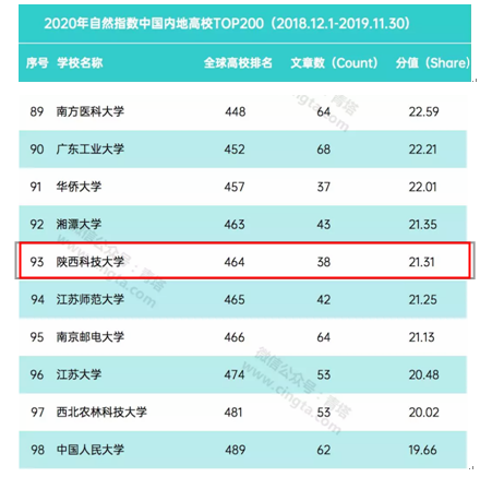 近日,自然指數(shù)(Nature Index)網(wǎng)站更新了2019年最新的自然指數(shù)排名(統(tǒng)計時間節(jié)點為2018.12.1—2019.11.30),我校位列全球高校第464位,較上期499位提高了35位;位列內(nèi)地高校第93位,較上期102位提升了9位。居陜西高校第5名,省屬高校第2名,原輕工院校第2名,為我校歷史最高排名。