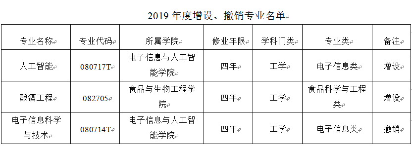 近日,教育部公布了《2019年度普通高等學(xué)校本科專業(yè)備案和審批結(jié)果的通知》(教高函〔2020〕2號),我校人工智能(080717T)、釀酒工程(082705)2個本科專業(yè)獲得教育部批準(zhǔn)設(shè)置,可從2020年開始招生。申報(bào)撤銷的電子信息科學(xué)與技術(shù)(080714T)本科專業(yè),從2020年停招。
