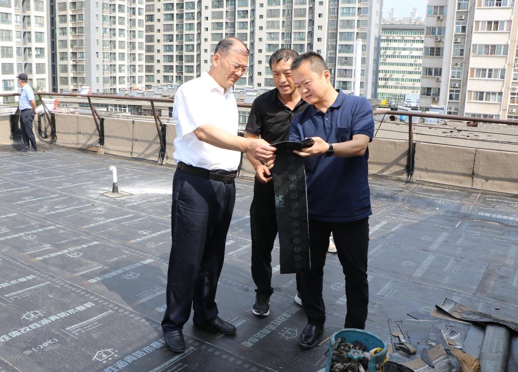 在咸陽(yáng)校區(qū),李志健、李學(xué)軍登上11號(hào)樓樓頂,檢查了屋面防水工程的開(kāi)展情況,感謝施工單位為推動(dòng)學(xué)校民生工程做出的努力,再三叮囑工作人員合理安排時(shí)間,在抓緊工期的同時(shí)注重質(zhì)量,杜絕安全隱患。