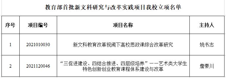 近日,教育部《關(guān)于公布首批新文科研究與改革實(shí)踐項(xiàng)目的通知》發(fā)布,我校姚書(shū)志教授主持的“新文科教育改革視閾下高校思政課綜合改革研究”、詹秦川教授主持的“‘三促進(jìn)建設(shè)、四結(jié)合推進(jìn)、四層級(jí)培養(yǎng)’——藝術(shù)類(lèi)大學(xué)生特色創(chuàng)新創(chuàng)業(yè)教育課程體系建設(shè)與改革”2個(gè)項(xiàng)目獲批立項(xiàng),立項(xiàng)數(shù)量居陜西省屬高校第二。