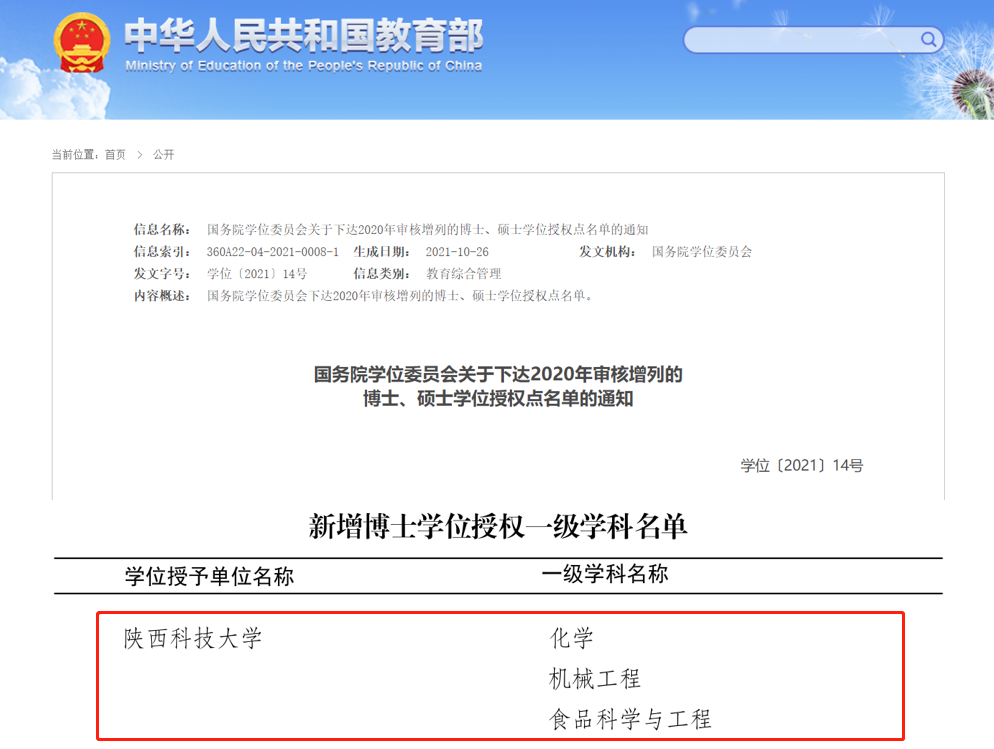 日前,國(guó)務(wù)院學(xué)位委員會(huì)下發(fā)了《關(guān)于下達(dá)2020年審核增列的博士、碩士學(xué)位授權(quán)點(diǎn)名單的通知》(學(xué)位〔2021〕14號(hào)),我?;瘜W(xué)、機(jī)械工程、食品科學(xué)與工程3個(gè)學(xué)科成功獲批一級(jí)學(xué)科博士學(xué)位授權(quán)點(diǎn)。一級(jí)學(xué)科博士點(diǎn)獲批數(shù)量位居陜西高校第2位、全國(guó)輕工類高校第1位。