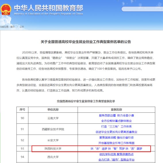 近日,教育部發(fā)布《關(guān)于全國普通高校畢業(yè)生就業(yè)創(chuàng)業(yè)工作典型案例名單的公告》,確定了100個(gè)優(yōu)秀典型案例,我校就業(yè)工作案例《扶“志”追夢,扶“智”筑夢,扶“質(zhì)”圓夢 全力做好家庭經(jīng)濟(jì)困難生就業(yè)工作》成功入選。這是我校就業(yè)工作案例首次入選該項(xiàng)評選活動。陜西省僅有我校與長安大學(xué)、西北大學(xué)三所高校入選。