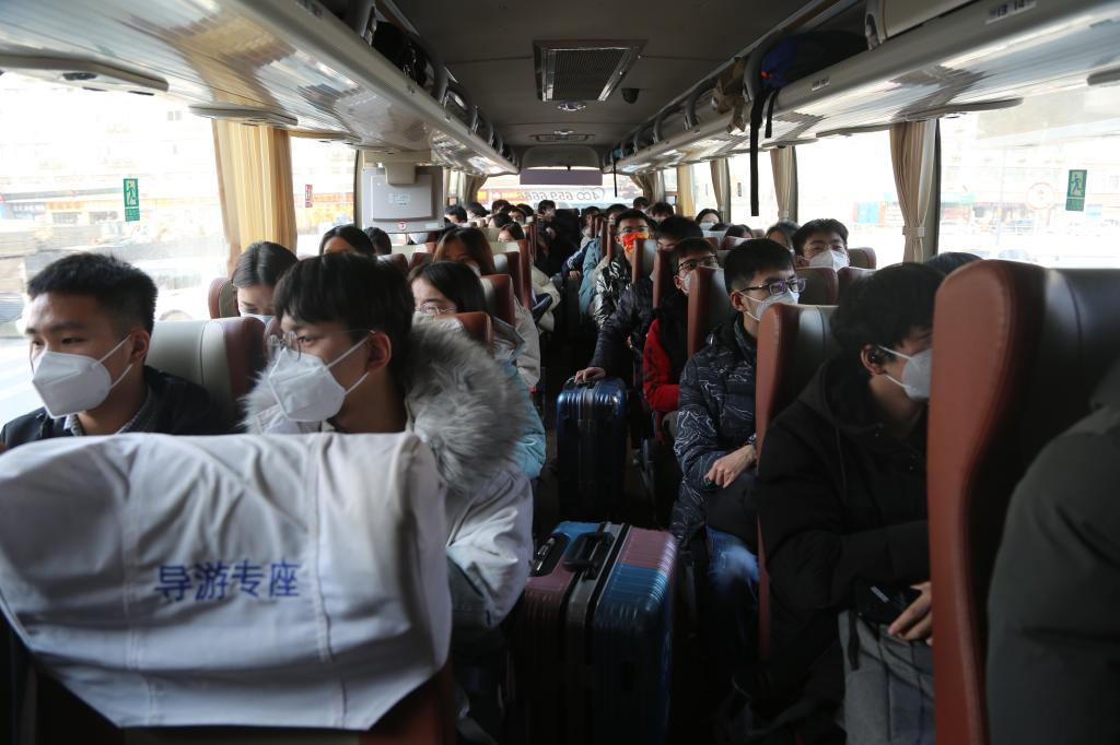 2022年1月16日晚22:00,第一批學(xué)生乘坐大巴車前往北客站,邁上回家路。