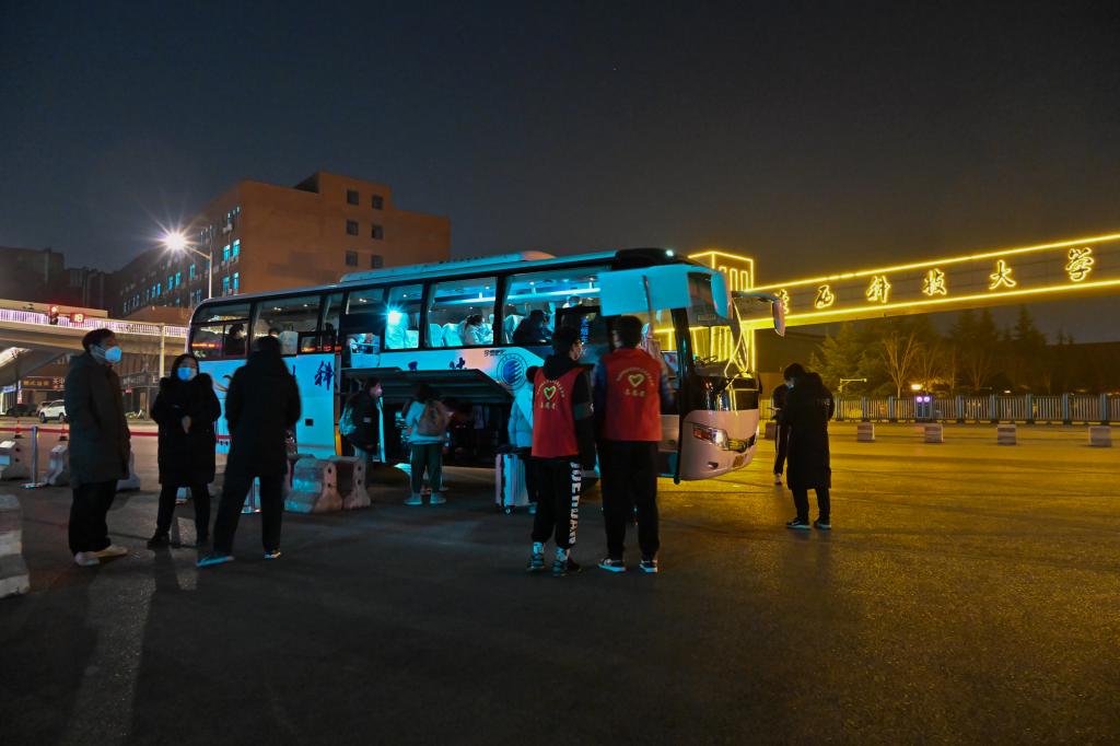 一手拿手機,一手拿對講機,左右手輪換接聽。學工部副部長田少寧擔任“陜科大客運站”的“調(diào)度師”。她說:“根據(jù)各學院上報的數(shù)據(jù),綜合協(xié)調(diào)組的工作人員會再核實篩查一次,確保數(shù)據(jù)精準,17日有四千多名學生返鄉(xiāng),我們安排了15輛大巴車,18日預測有一萬多名學生,我們連夜及時聯(lián)系每個學院的學生工作負責人現(xiàn)場擔任發(fā)車員,開展學生登車、搬運行李、行前叮囑等工作,也根據(jù)學生離?,F(xiàn)場出現(xiàn)的問題現(xiàn)場辦公,保衛(wèi)處收取離校審批單,和學工系統(tǒng)大力協(xié)同,提高離校效率。從17、18兩日的情況來看,我們整個運送過程平穩(wěn)有序,而且充分做到了人車匹配,不空座、不浪費?!?/p>