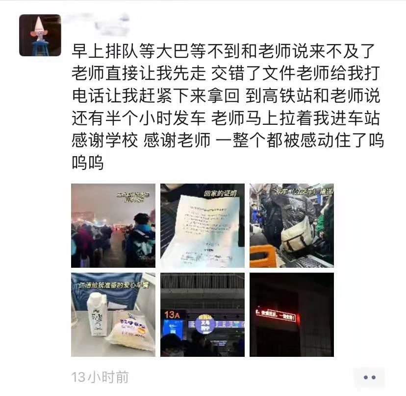 其他9個聯(lián)絡小組也“平行作戰(zhàn)”,陸續(xù)完成對接。1月18日,校黨委組織部部長楊建顧不上頸椎疼痛,帶著頸托來到學校門口,把一批批學生送上返鄉(xiāng)的長途汽車。
