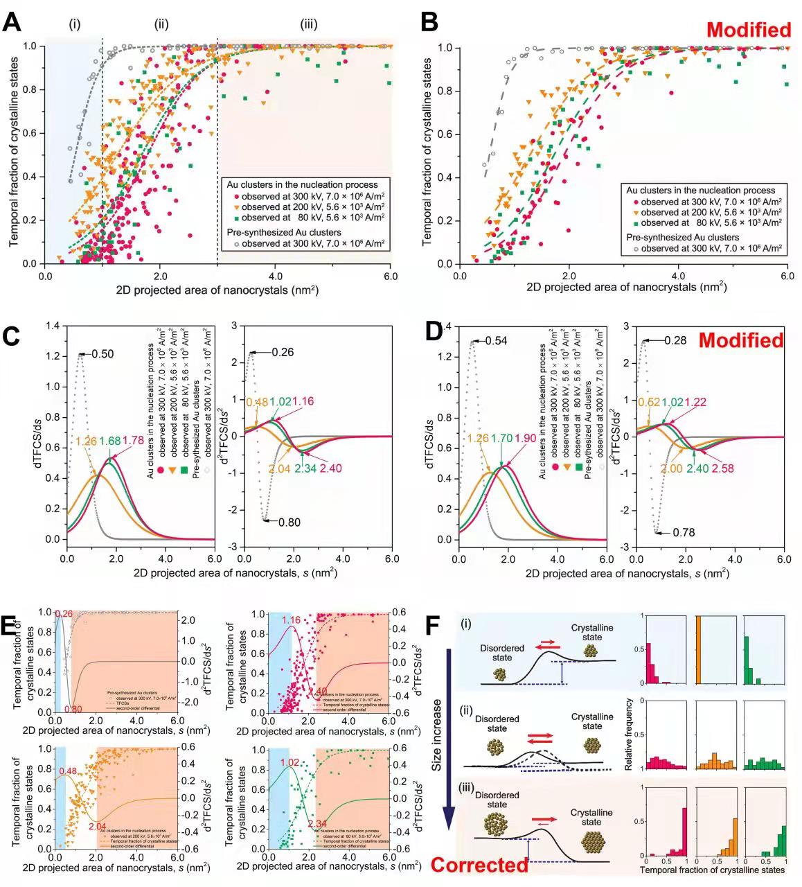 經(jīng)典成核理論中,亞穩(wěn)的無序致密液體或無定形固體團(tuán)簇自發(fā)且不可逆成核已有共識(shí),但是否存在其它成核過程及相關(guān)機(jī)理一直是學(xué)術(shù)界長(zhǎng)期關(guān)注的焦點(diǎn)問題。于成龍等人在長(zhǎng)期相關(guān)研究積累基礎(chǔ)上,通過分析邏輯函數(shù)進(jìn)行響應(yīng)區(qū)域劃分的合理性,發(fā)現(xiàn)Sungho Jeon等人用“幻數(shù)”進(jìn)行區(qū)域劃分具有誤導(dǎo)性,舉例論證了若使用“幻數(shù)”進(jìn)行劃分會(huì)導(dǎo)致不同電子束輻照條件下的區(qū)域缺失或交錯(cuò);提出了依據(jù)邏輯函數(shù)的一階和二階微分方程確定響應(yīng)區(qū)域具有統(tǒng)計(jì)意義,并將邏輯函數(shù)與一級(jí)相變熱力學(xué)結(jié)合推導(dǎo)出動(dòng)態(tài)可逆波動(dòng)中存在臨界尺度。研究結(jié)果修正了Sungho Jeon等人所獲得的原子晶體成核的動(dòng)態(tài)可逆波動(dòng)過程發(fā)生于極小團(tuán)簇尺寸范圍內(nèi)的結(jié)論,認(rèn)為序變發(fā)生于臨界尺寸附近,熱力學(xué)判據(jù)應(yīng)為輻照條件下無序與有序狀態(tài)之間非常小的相變勢(shì)壘,動(dòng)力學(xué)判據(jù)應(yīng)為團(tuán)簇形狀因子調(diào)控的表面或界面形狀效應(yīng)。