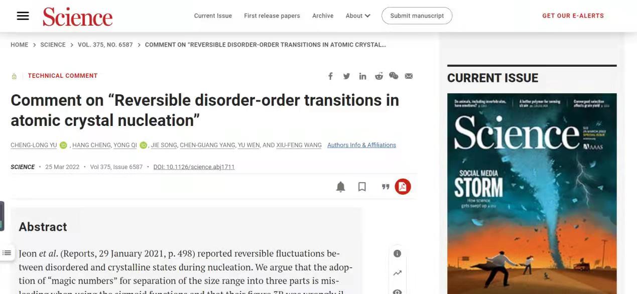 3月25日,《SCIENCE》在線發(fā)表了我校于成龍、程航、齊勇、宋杰、楊晨光、文毓、王秀峰合作撰寫的論文《Comment on “Reversible disorder-order transitions in atomic crystal nucleation”》。該論文發(fā)現(xiàn),韓國(guó)漢陽(yáng)大學(xué)Sungho Jeon等人2021年1月29日發(fā)表于《Science》的關(guān)于原子晶體成核動(dòng)態(tài)結(jié)構(gòu)序變(Dynamic structural fluctuation)發(fā)生于極小團(tuán)簇尺度范圍內(nèi)的結(jié)論有誤,提出了晶體成核動(dòng)態(tài)結(jié)構(gòu)序變更傾向于發(fā)生于臨界尺度附近的新觀點(diǎn)。