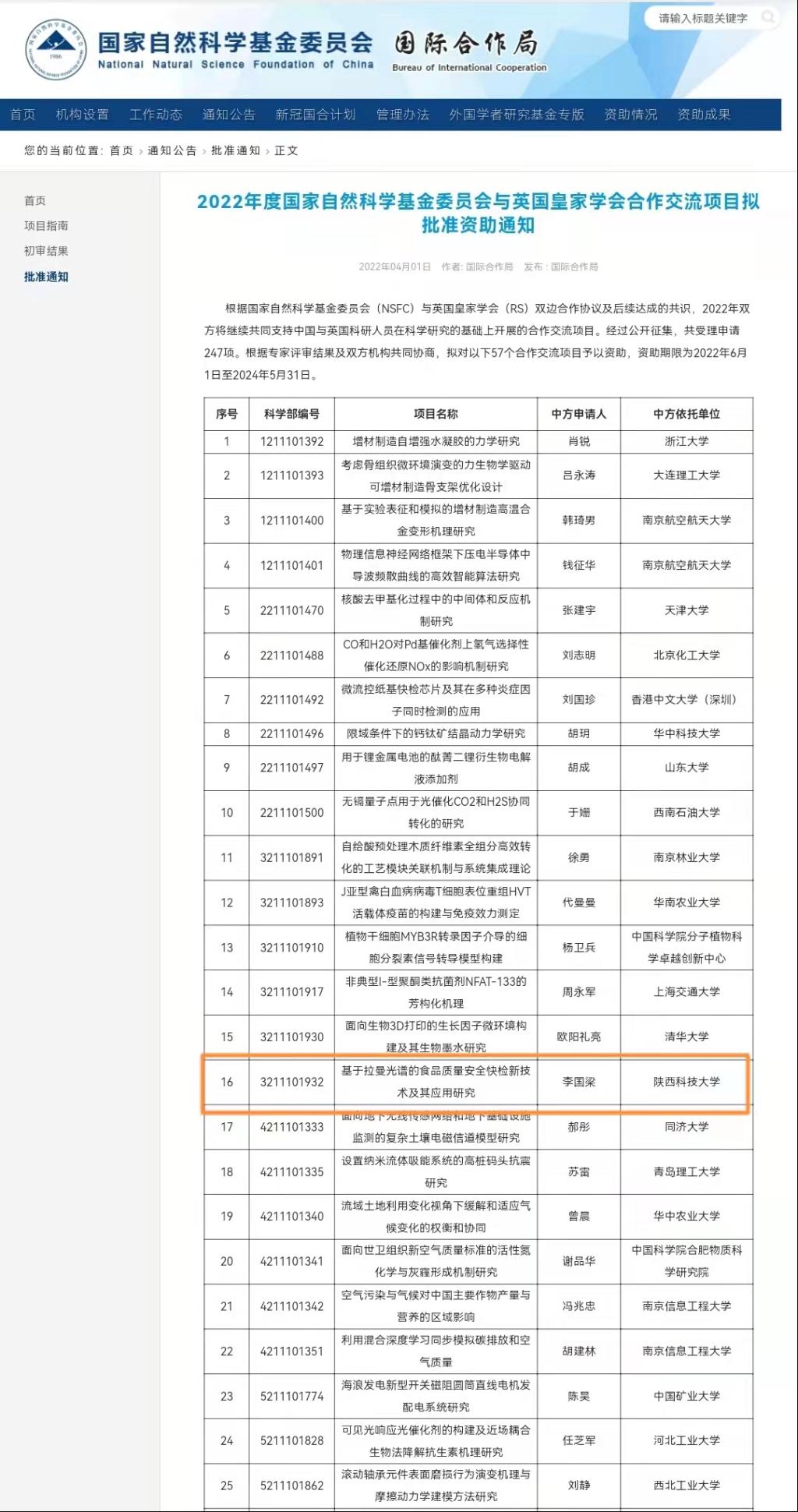 食品科學(xué)與工程學(xué)院李國(guó)梁教授申報(bào)的“基于拉曼光譜的食品質(zhì)量安全快檢新技術(shù)及其應(yīng)用研究”項(xiàng)目獲得國(guó)家自然科學(xué)基金委員會(huì)與英國(guó)皇家學(xué)會(huì)合作交流項(xiàng)目資助。該類項(xiàng)目支持中國(guó)與英國(guó)科研人員在科學(xué)研究的基礎(chǔ)上開展合作交流項(xiàng)目。2022年經(jīng)公開征集,共受理申請(qǐng)247項(xiàng),根據(jù)專家評(píng)審結(jié)果及雙方機(jī)構(gòu)共同協(xié)商,共資助57個(gè)合作交流項(xiàng)目,陜西省共有5個(gè)項(xiàng)目獲得資助。