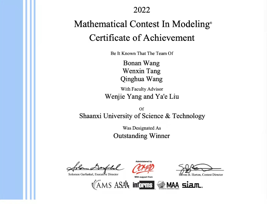 近日,2022年美國(guó)大學(xué)生數(shù)學(xué)建模競(jìng)賽(MCM/ICM)成績(jī)正式揭曉,我校獲得特等獎(jiǎng)1項(xiàng)、二等獎(jiǎng)3項(xiàng)、三等獎(jiǎng)5項(xiàng)的優(yōu)異成績(jī)。數(shù)學(xué)與數(shù)據(jù)科學(xué)學(xué)院王博楠、唐文心、王清華三位同學(xué)組建的團(tuán)隊(duì)為我校首次獲得特等獎(jiǎng)(Outstanding)。MCM全球共23個(gè)團(tuán)隊(duì)獲得特等獎(jiǎng)。