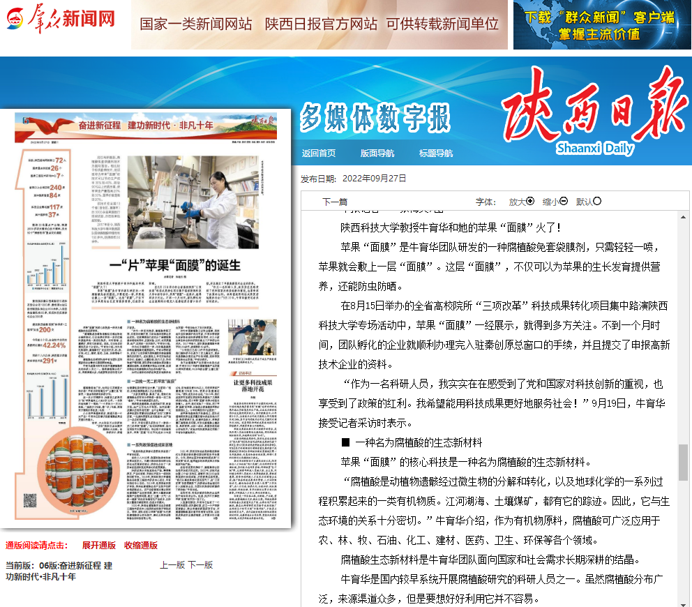 9月27日,《陜西日報》在“奮進新征程 建功新時代·非凡十年”系列報道專版中專題報道我校牛育華教授團隊面向國家和社會需求長期深耕,研發(fā)出擁有國際首創(chuàng)技術(shù)的蘋果“面膜”,在促進科技成果轉(zhuǎn)化的政策措施推動下,團隊孵化的企業(yè)入駐秦創(chuàng)原總窗口,用科技成果更好地服務(wù)鄉(xiāng)村振興。