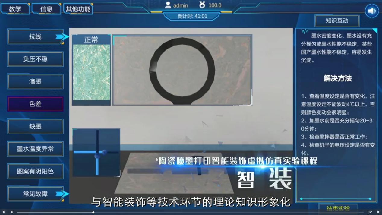 《陶瓷噴墨打印智能裝飾技術(shù)虛擬仿真實(shí)驗(yàn)》由劉輝教授主持,該課程通過(guò)虛擬仿真實(shí)驗(yàn)教學(xué),將陶瓷生產(chǎn)過(guò)程中的噴墨打印工藝、產(chǎn)品圖案設(shè)計(jì)與智能裝飾等技術(shù)環(huán)節(jié)的理論知識(shí)形象化,為學(xué)生搭建理論與實(shí)踐的橋梁,通過(guò)實(shí)操性的訓(xùn)練,讓學(xué)生更多地參與到課堂之中,將專業(yè)思維創(chuàng)新賦予實(shí)踐并進(jìn)行檢驗(yàn),促進(jìn)學(xué)生知識(shí)體系的整體建立,同時(shí)增加學(xué)生的自主創(chuàng)新能力,知識(shí)轉(zhuǎn)化能力及綜合管理能力,為學(xué)生畢業(yè)從事陶瓷行業(yè)專業(yè)技術(shù)工作奠定良好的基礎(chǔ)。