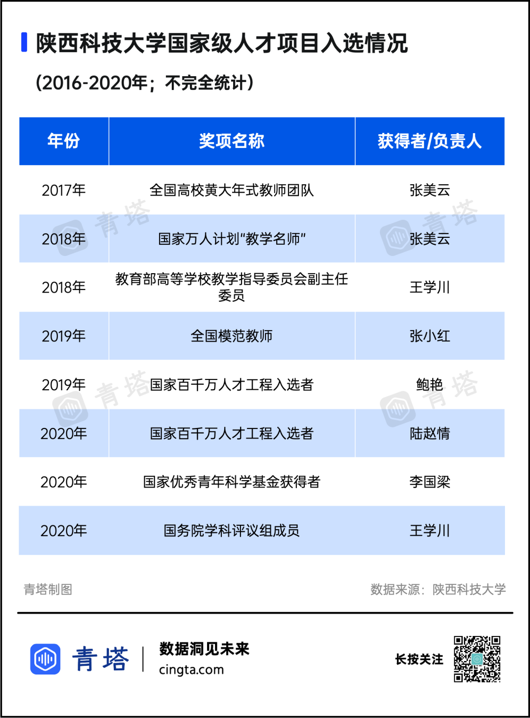 青塔是全國(guó)領(lǐng)先的第三方高等教育數(shù)據(jù)服務(wù)機(jī)構(gòu),專(zhuān)注于全球高等教育數(shù)據(jù)的持續(xù)挖掘和深度分析,通過(guò)高等教育+互聯(lián)網(wǎng)+大數(shù)據(jù)的創(chuàng)新結(jié)合方式,持續(xù)向大眾和專(zhuān)業(yè)用戶提供高質(zhì)量的高教信息和專(zhuān)業(yè)數(shù)據(jù)服務(wù)。作為國(guó)內(nèi)影響力第一的高等教育新媒體,青塔也通過(guò)覆蓋全網(wǎng)的全媒體矩陣,面向大眾發(fā)布高質(zhì)量的高教內(nèi)容。青塔全年各個(gè)新媒體渠道保持穩(wěn)定增長(zhǎng),積極拓展自主平臺(tái),斬獲中國(guó)微信公眾號(hào)500強(qiáng)、澎湃數(shù)據(jù)新聞獎(jiǎng)、網(wǎng)易新聞年度最具影響力獎(jiǎng)、頭條青云計(jì)劃。