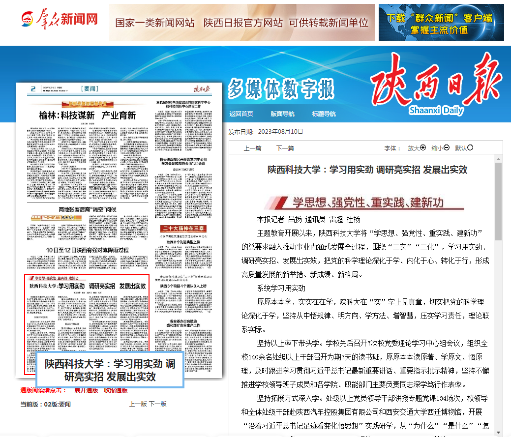 主題教育開展以來,我校將“學思想、強黨性、重實踐、建新功”的總要求融入推動事業(yè)內(nèi)涵式發(fā)展全過程,圍繞“三實”“三化”,學習用實勁、調研亮實招、發(fā)展出實效,把黨的科學理論深化于學、內(nèi)化于心、轉化于行,形成高質量發(fā)展的新舉措、新成績、新格局。8月10日,《陜西日報》要聞版對我校主題教育開展情況及取得成績進行報道。