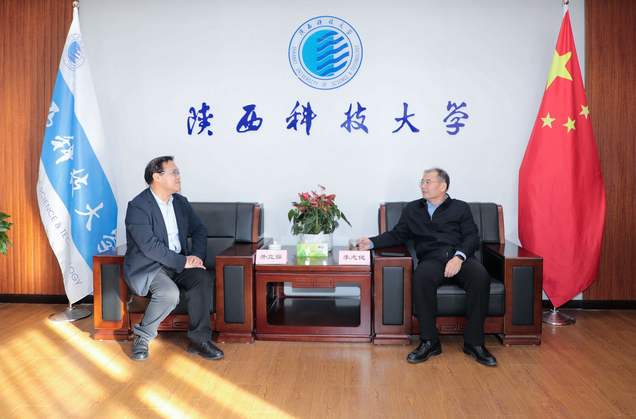 李志健代表學校對井立強表示歡迎,并介紹了學校近年來發(fā)展情況和取得的一系列成績。井立強對我校的熱情接待表示感謝,對陜西科技大學在各方面取得的成績表示贊賞,同時介紹了黑龍江大學的基本情況。我校環(huán)境科學與工程學院(碳中和科學與技術(shù)學院)黨委書記李廣明、學術(shù)院長王傳義等參加會見。
