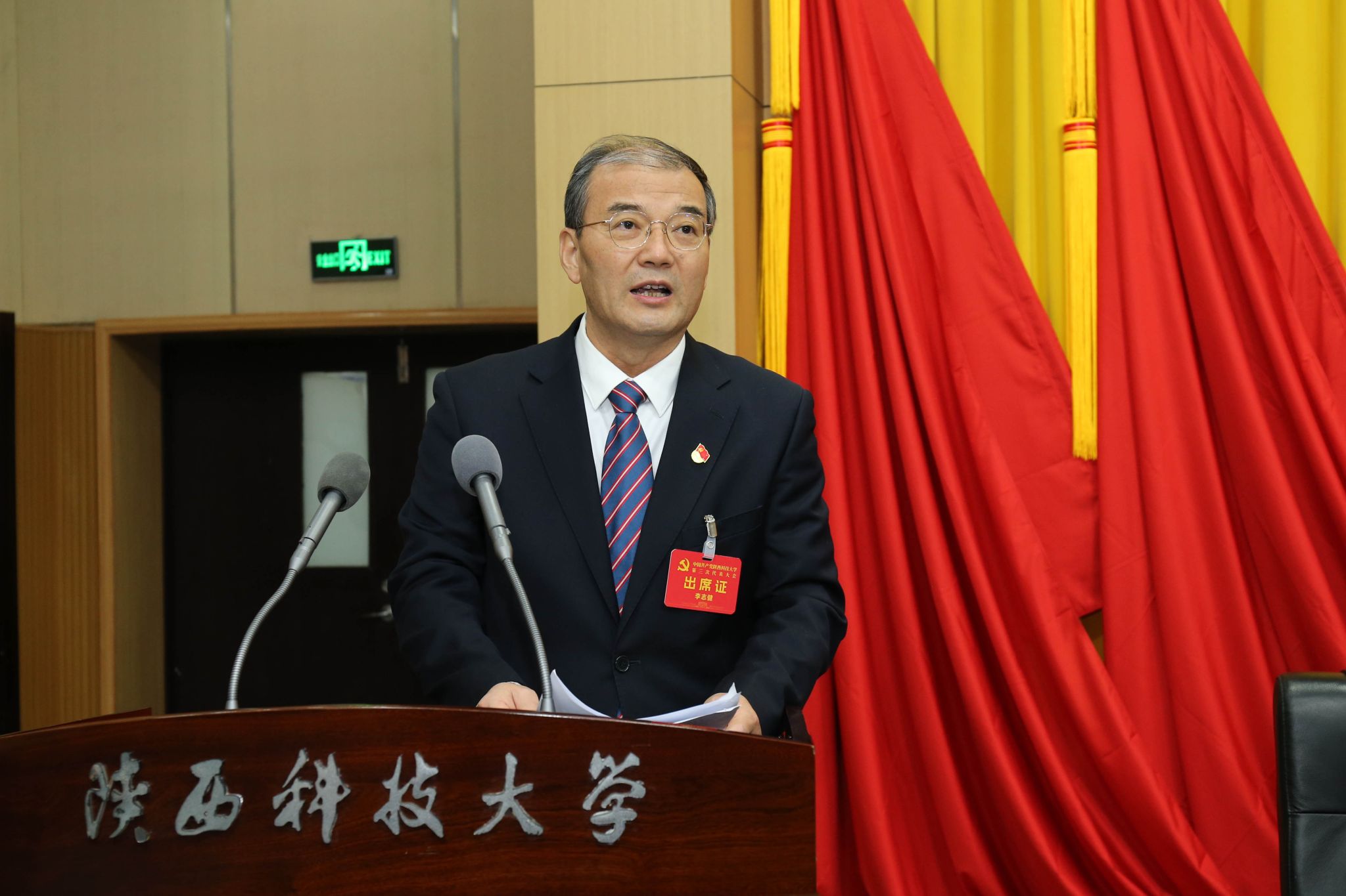 大會會場內(nèi)氛圍莊重?zé)崃摇V飨_上方懸掛著“中國共產(chǎn)黨陜西科技大學(xué)第三次代表大會”會標(biāo)。主席臺正中懸掛著鐮刀錘頭組成的金色黨徽,熠熠生輝;10面鮮艷的紅旗分列兩側(cè),交相輝映。會場后方,“強(qiáng)基固本 蓄勢賦能 為推動學(xué)校高質(zhì)量發(fā)展 譜寫“雙一流”建設(shè)新篇章而努力奮斗”的橫幅鼓舞人心、催人奮進(jìn)。