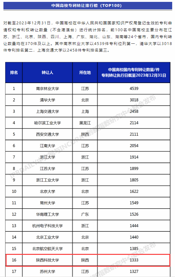 近日,全球知識(shí)產(chǎn)權(quán)綜合信息服務(wù)提供商IPRdaily與incoPat創(chuàng)新指數(shù)研究中心聯(lián)合發(fā)布“中國(guó)高校專利轉(zhuǎn)讓排行榜(TOP100)”(下文簡(jiǎn)稱“榜單”),我校以轉(zhuǎn)讓1333件專利居全國(guó)高校排名第16位,陜西高校第2位,取得歷史性突破,學(xué)校連續(xù)五年位列該榜單前50強(qiáng)。