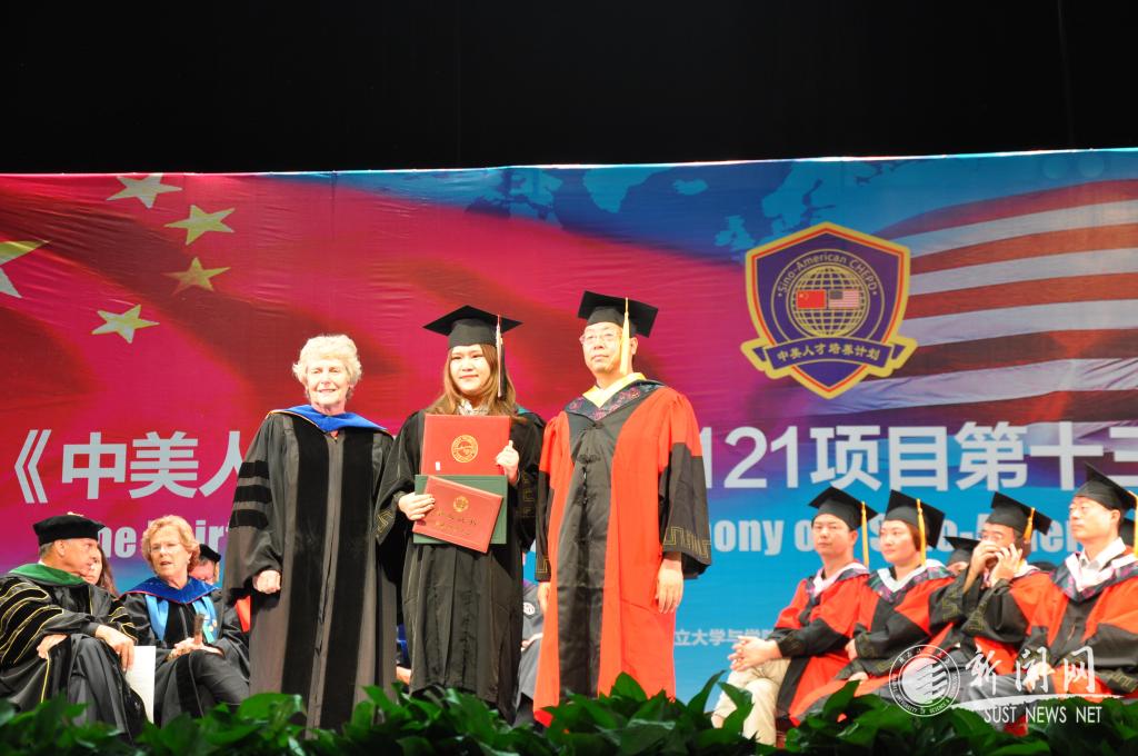教務(wù)處處長鄭恩讓在年會上與美國東華盛頓大學(xué)教務(wù)長琳達(dá)·凱菲爾女士共同為我校輕工科學(xué)與工程學(xué)院包裝工程專業(yè)12級雍樂同學(xué)頒授中美雙學(xué)位畢業(yè)證和學(xué)位證書,雍樂也是我校首位121項(xiàng)目畢業(yè)生。據(jù)了解,在本屆121項(xiàng)目210多名畢業(yè)生中,雍樂同學(xué)獲評“2016年度優(yōu)秀畢業(yè)生”。