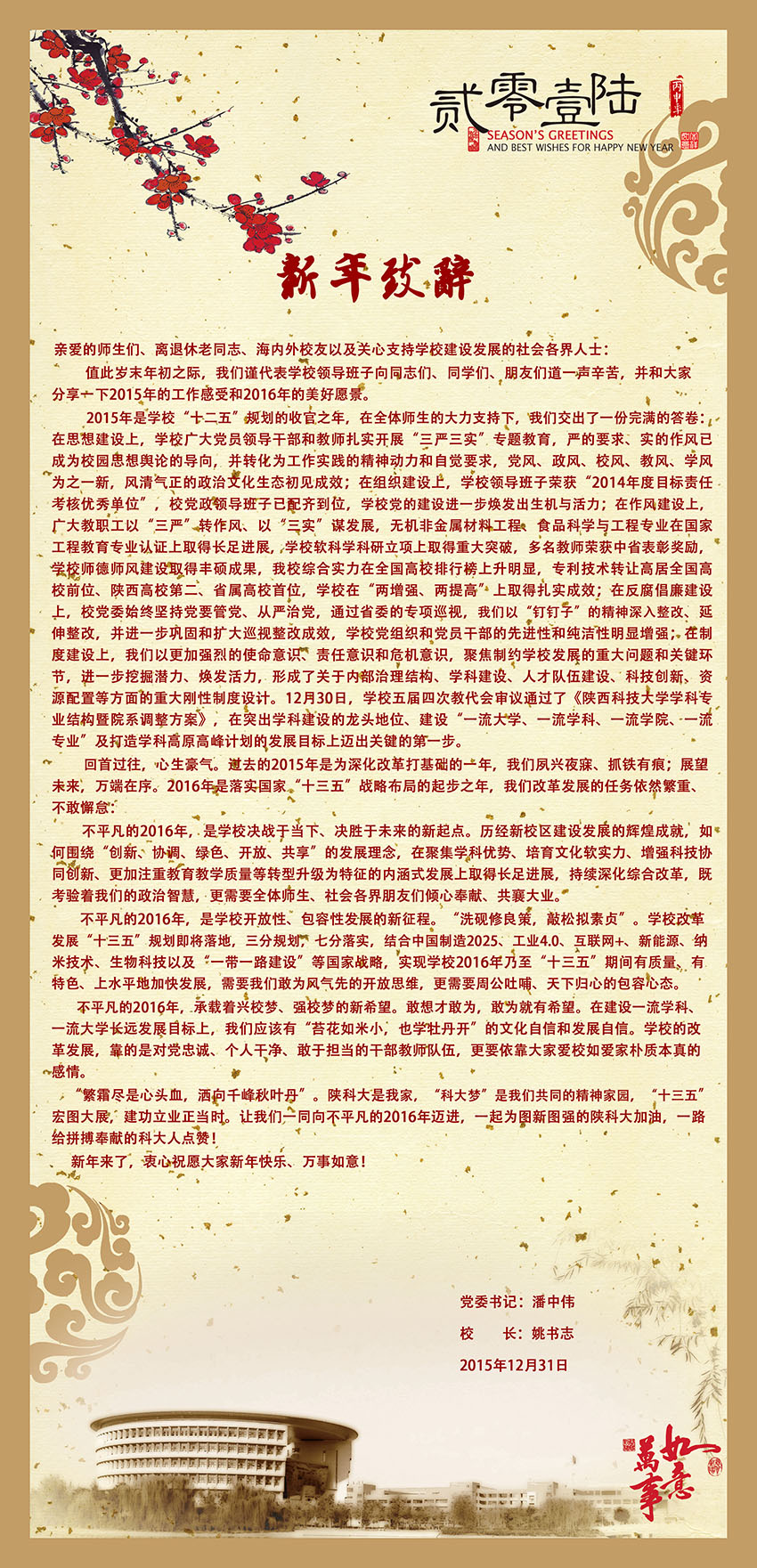 按:值此新年來臨之際,校黨委書記潘中偉同志、校長姚書志同志發(fā)表新年致辭,向全體師生、離退休老同志、海內(nèi)外校友以及關(guān)心支持學(xué)校建設(shè)發(fā)展的社會各界人士致以新年的問候及美好的祝愿。