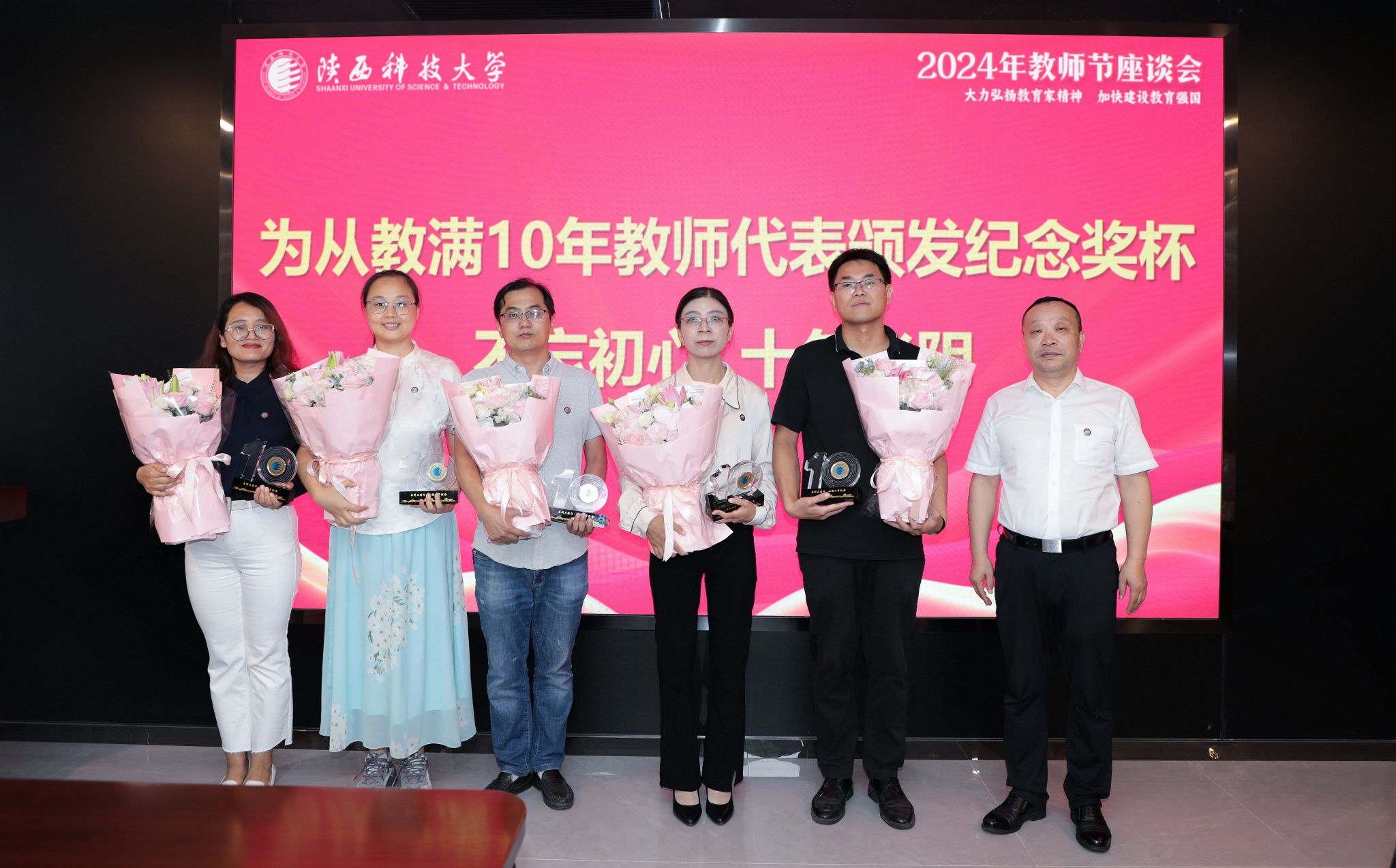 “剛開始站上講臺的時候,會覺得局促不安,每天想的最多的是‘我怎樣才能上完這節(jié)課’,上完課后會覺得很放松;現(xiàn)在每天想的是‘我該怎樣講,學生才能接受的多一些,該如何組織課堂,才能讓學生收獲比知識更多、可以受益終身的東西’。往后二十年里,我將與陜科大一起共同進步,不斷提升教學科研水平,助力學校實現(xiàn)復興騰飛夢想。”從教滿10年教師代表曹曉倩談了與學校一起成長的蛻變。