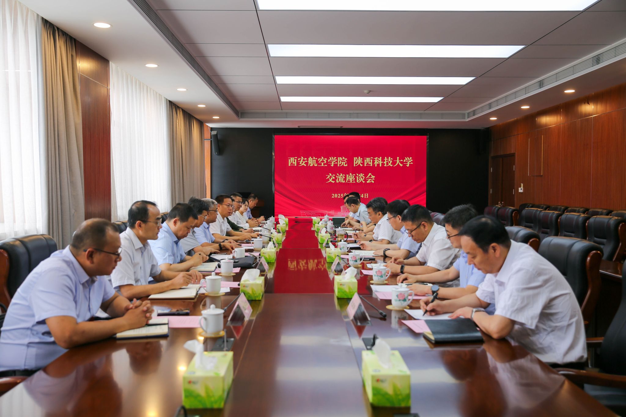 西安航空學(xué)院黨政辦、人事處、教務(wù)處、發(fā)展規(guī)劃處、學(xué)科辦、科技處,陜西科技大學(xué)黨辦校辦、人事處、教務(wù)處、發(fā)展規(guī)劃處、研究生院、科技處負(fù)責(zé)人參加座談。