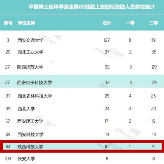 根據(jù)全國(guó)領(lǐng)先的高等教育信息服務(wù)機(jī)構(gòu)青塔網(wǎng)公布的排名數(shù)據(jù),我校此次獲批數(shù)量位居全國(guó)博士后設(shè)站單位第84名、原輕工類院校第2名、陜西高校第9名,資助獲批率為62.5%。據(jù)悉2018年全國(guó)獲批率約為33%。