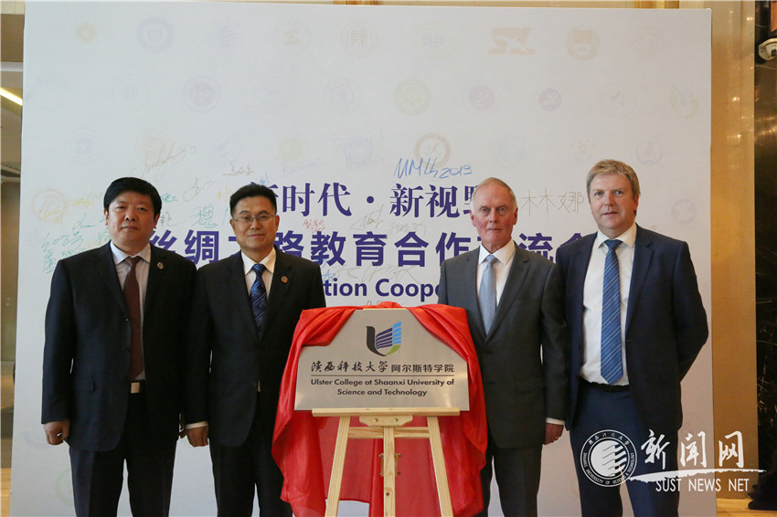 交流會上,陜西省副省長方光華、我校校長馬建中與阿爾斯特大學(xué)(Ulster University)副校監(jiān)及管理委員會主席約翰·亨特(John Hunter)為雙方共建的中外合作辦學(xué)機構(gòu)——“陜西科技大學(xué)阿爾斯特學(xué)院”揭牌。