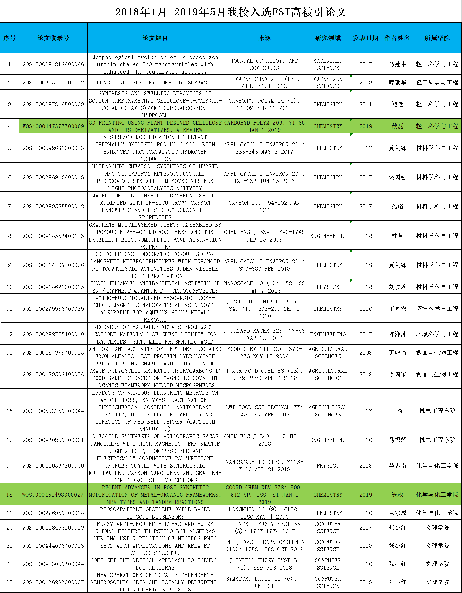 注:綠色為本期新進ESI高被引論文