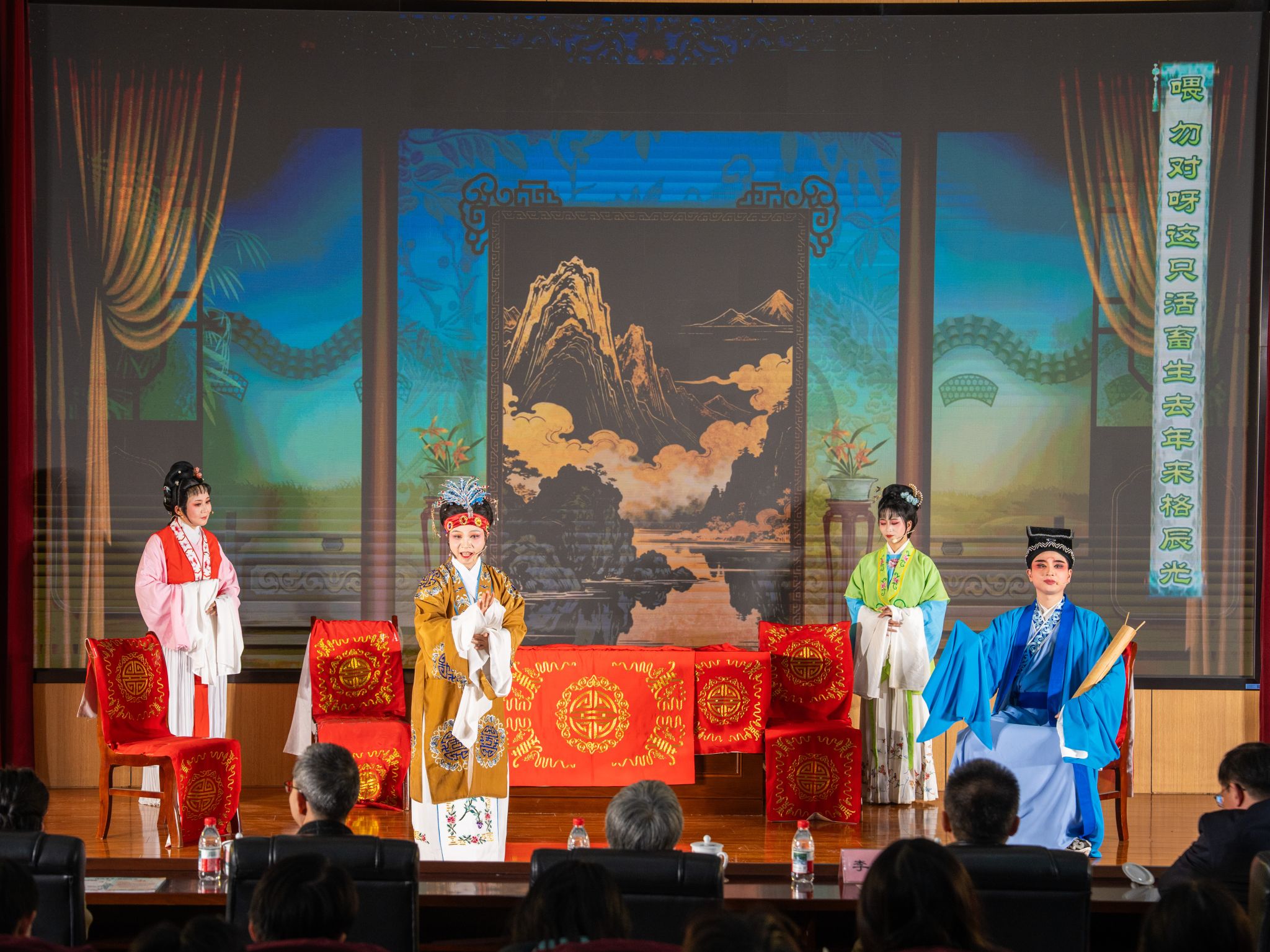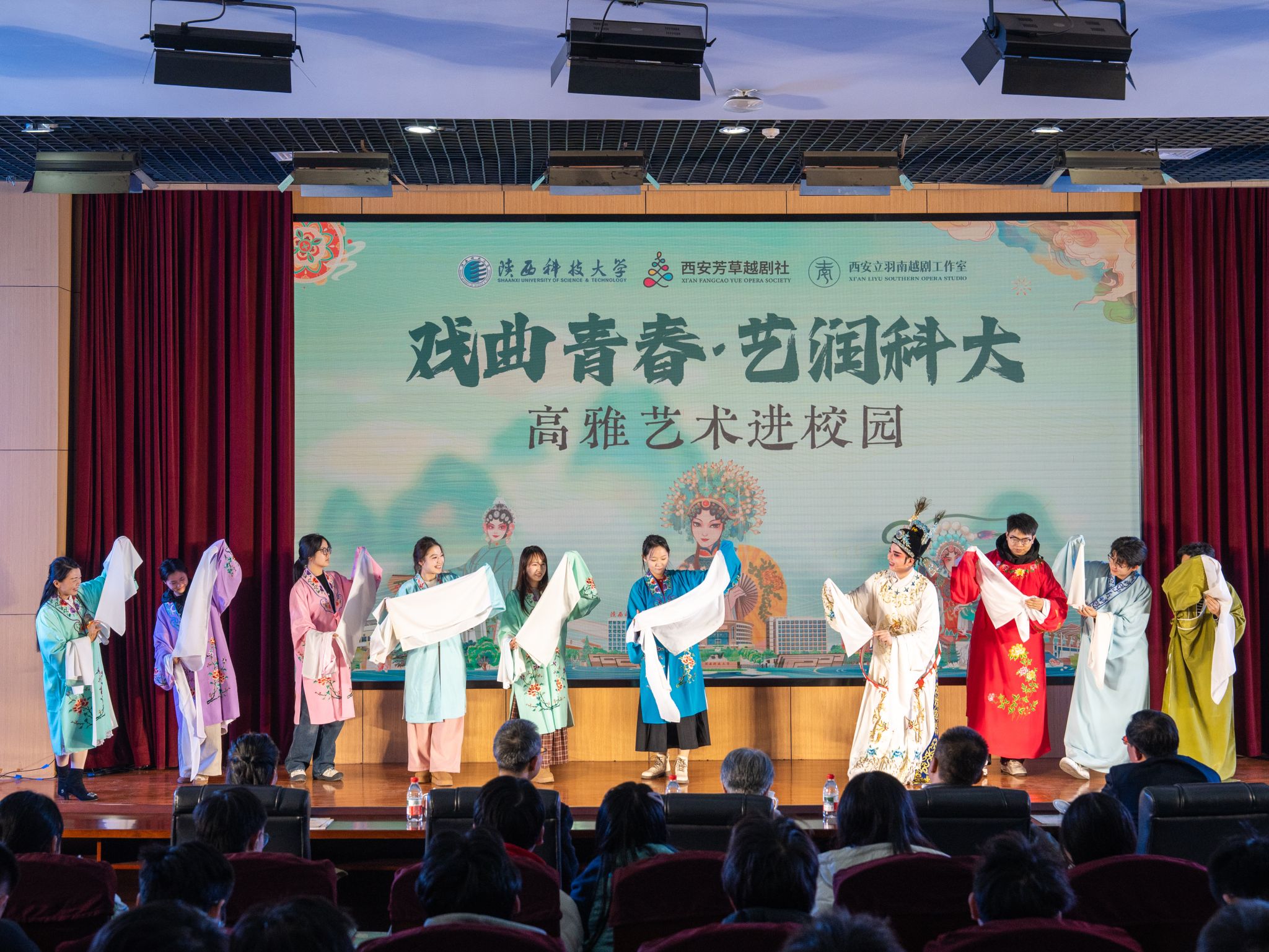 為深入學(xué)習(xí)貫徹習(xí)近平文化思想,響應(yīng)美育浸潤(rùn)行動(dòng)部署,讓青年學(xué)子近距離感受中華戲曲藝術(shù)的魅力,12月11日晚,由黨委宣傳部、校團(tuán)委聯(lián)合舉辦的“戲曲青春·藝潤(rùn)科大”高雅藝術(shù)進(jìn)校園活動(dòng)在學(xué)校圖書(shū)館學(xué)術(shù)報(bào)告廳舉辦?;顒?dòng)特邀西安芳草越劇社、西安立羽南越劇工作室聯(lián)袂,為師生送上一場(chǎng)視聽(tīng)盛宴。校領(lǐng)導(dǎo)、相關(guān)職能部門(mén)負(fù)責(zé)人、校友代表、師生代表等500余人觀看演出。