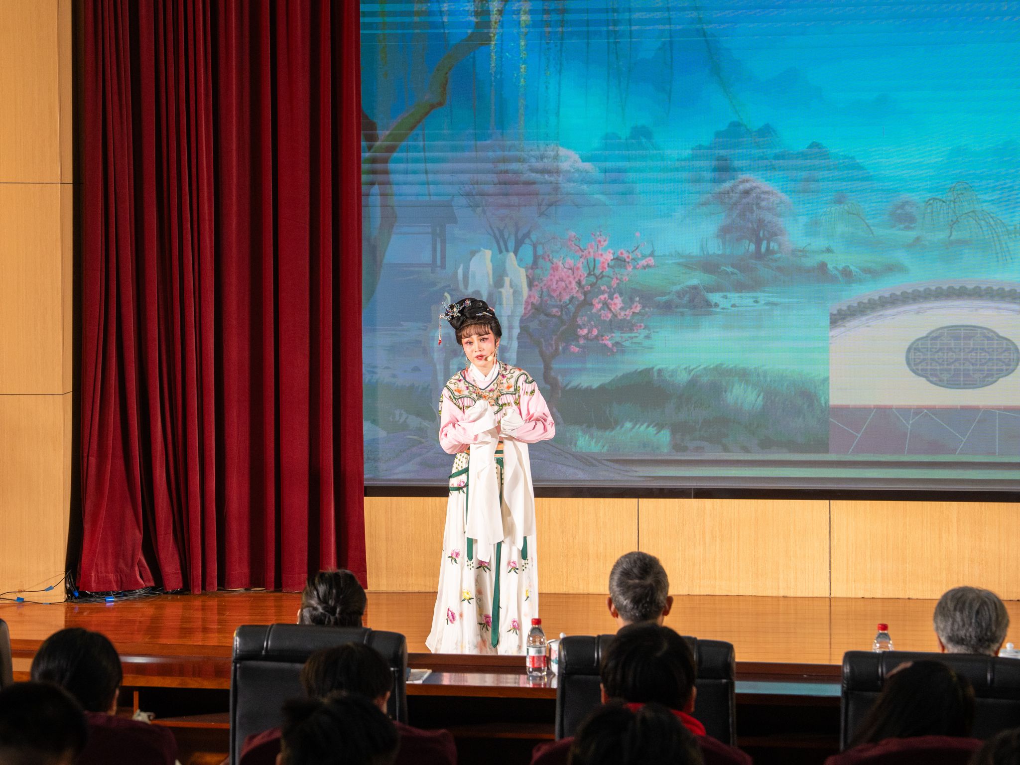 整場(chǎng)演出以越劇為主,并集合了秦腔、豫劇、黃梅戲等地方戲曲名段,演員們精彩演繹了越劇《追魚(yú)·觀燈》《珍珠塔·出京》《珍珠塔·后見(jiàn)姑》《孔雀東南飛·洞房》《紅樓夢(mèng)·黛玉葬花》《西廂記·琴心》,秦腔《焚香記·打神告廟》《火焰駒》《黃鶴樓》,京劇《柳蔭記》,豫劇《穆桂英掛帥》,黃梅戲《牛郎織女》等選段,聲情并茂,精彩紛呈,引導(dǎo)師生在藝術(shù)鑒賞中提升審美素養(yǎng),在文化浸潤(rùn)中堅(jiān)定文化自信。