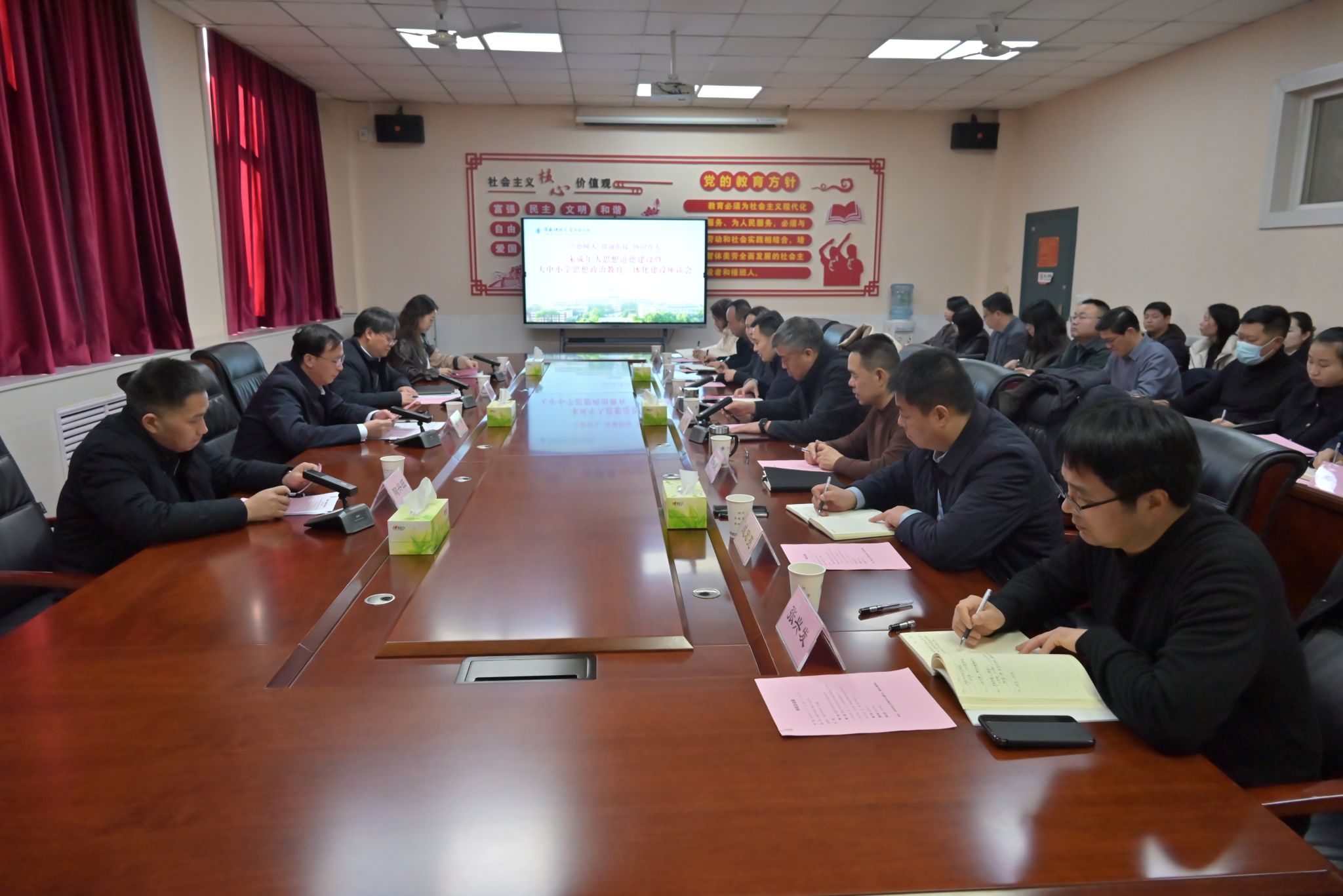 1月12日,陜西科技大學(xué)附屬中學(xué)召開未成年人思想道德建設(shè)暨大中小學(xué)思想政治教育一體化建設(shè)座談會,宣傳部、馬克思主義學(xué)院、中共黨史黨建學(xué)院、網(wǎng)絡(luò)思想政治工作中心有關(guān)負(fù)責(zé)同志受邀出席會議。附屬中學(xué)及聯(lián)合辦學(xué)單位相關(guān)負(fù)責(zé)人、思政課教師及班主任代表參加會議,會議由附屬中學(xué)校長李述麟主持。