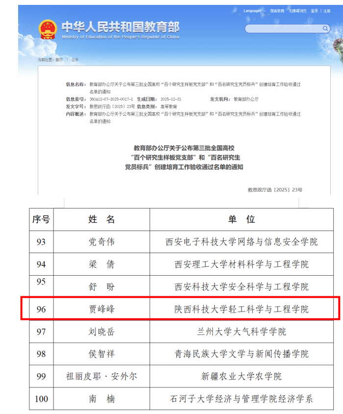 近日,教育部辦公廳印發(fā)《關(guān)于公布第三批全國高校“百個研究生樣板黨支部”和“百名研究生黨員標(biāo)兵”創(chuàng)建培育工作驗(yàn)收通過名單的通知》,陜西科技大學(xué)推選的第三批全國研究生黨員標(biāo)兵創(chuàng)建培育項(xiàng)目順利通過驗(yàn)收。