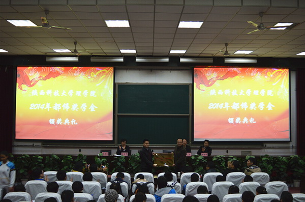12月5日晚,理學(xué)院2014年“都偉獎學(xué)金”頒獎典禮在3號教學(xué)樓102教室隆重舉行?!岸紓オ剬W(xué)金”創(chuàng)立人、電子科學(xué)與技術(shù)專業(yè)98級校友、上海都偉光伏科技有限公司總經(jīng)理許期斌出席獎學(xué)金頒獎典禮并為學(xué)生作了題為“大學(xué)生成長與奮斗”的報告會。