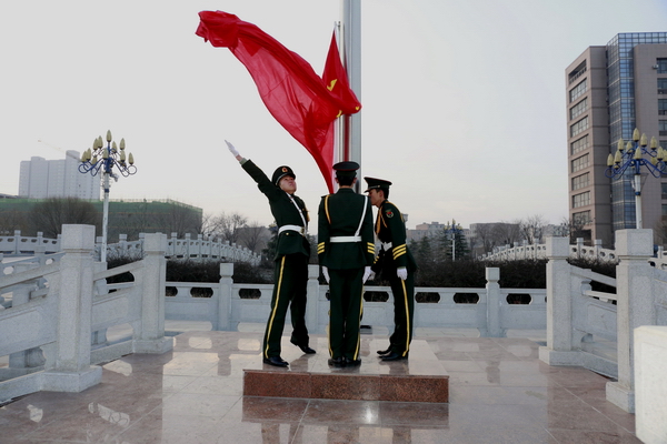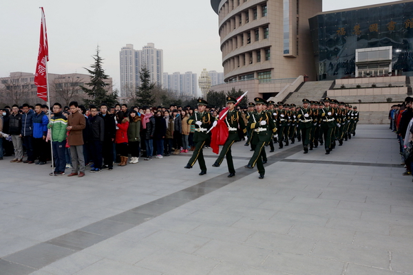 清晨,雖然已是數(shù)九寒天,但圖書館南廣場上已經(jīng)聚集了數(shù)千名前來觀禮的師生。7點(diǎn)50分,校國旗護(hù)衛(wèi)隊(duì)的隊(duì)員們?cè)谧鲎詈蟮闹b整理,雖然已經(jīng)執(zhí)行過幾十次升旗儀式,但在這個(gè)特殊的日子,他們還是感到格外緊張。7點(diǎn)55分,50名身穿禮服的國旗護(hù)衛(wèi)隊(duì)員邁著矯健的步伐走向旗臺(tái)。8點(diǎn)整,伴隨著雄壯的國歌聲和一聲“敬禮”,國旗在半空中劃出了一道美麗的弧線。在場的每一個(gè)人臉上都露出了激動(dòng)的神情。