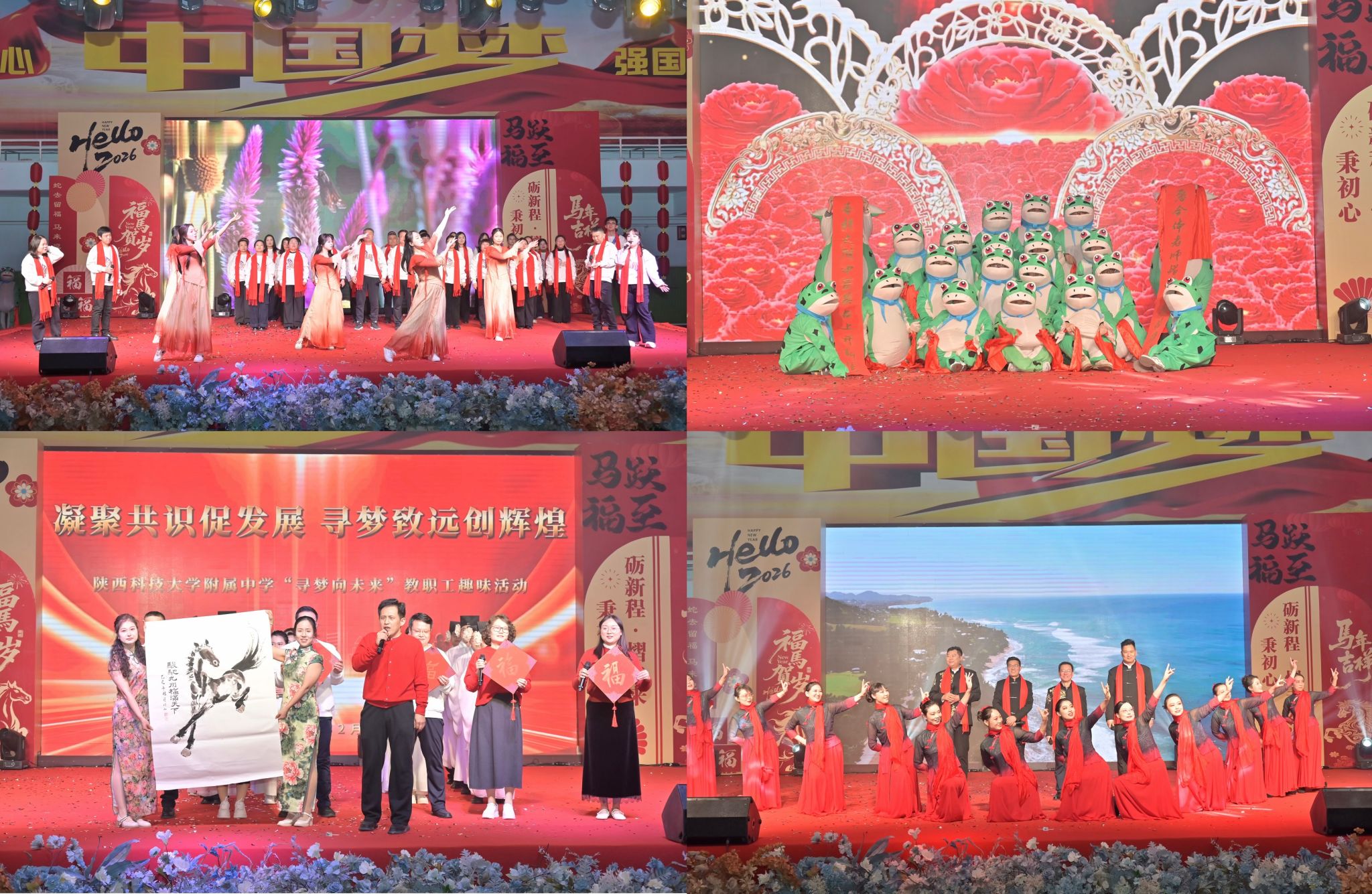 活動在小學部《張燈結彩踏浪迎春》的舞蹈中拉開序幕。各學科組與部門依次登臺:英語組《尋夢大唐筑夢未來》融合時裝秀與朗誦,傳統(tǒng)韻味與教育初心碰撞出別樣火花;語文組《躬耕教壇強國有我》以激昂朗誦,道出教育工作者的使命擔當;體音美組《秀出自我舞動青春》將走秀與舞蹈結合,盡顯陽光風采;數(shù)學組《數(shù)韻啟智逐光而行》融入朗誦與手勢舞,讓數(shù)字煥發(fā)靈動生機;初中部節(jié)目《當期末來臨的時候》幽默融合配音、歌曲與舞蹈,生動演繹了師生的教育日常;政史地組歌曲串燒《朋友,明天會更好》傳遞溫情與期許,掀起全場合唱熱潮;理化生組《蛙舞串燒》動感十足,活力滿滿;機關部門歌伴舞《珊瑚頌》深情詮釋了行政服務崗位的奉獻精神;高中部《上春山》舞姿優(yōu)美,寓意附中事業(yè)蓬勃發(fā)展?;顒釉谌=搪毠ど钋槌懙摹断嘤H相愛一家人》中圓滿落幕,真摯深情的歌聲,凝聚起全體附中人同心同行、共創(chuàng)未來的堅定信心與力量。