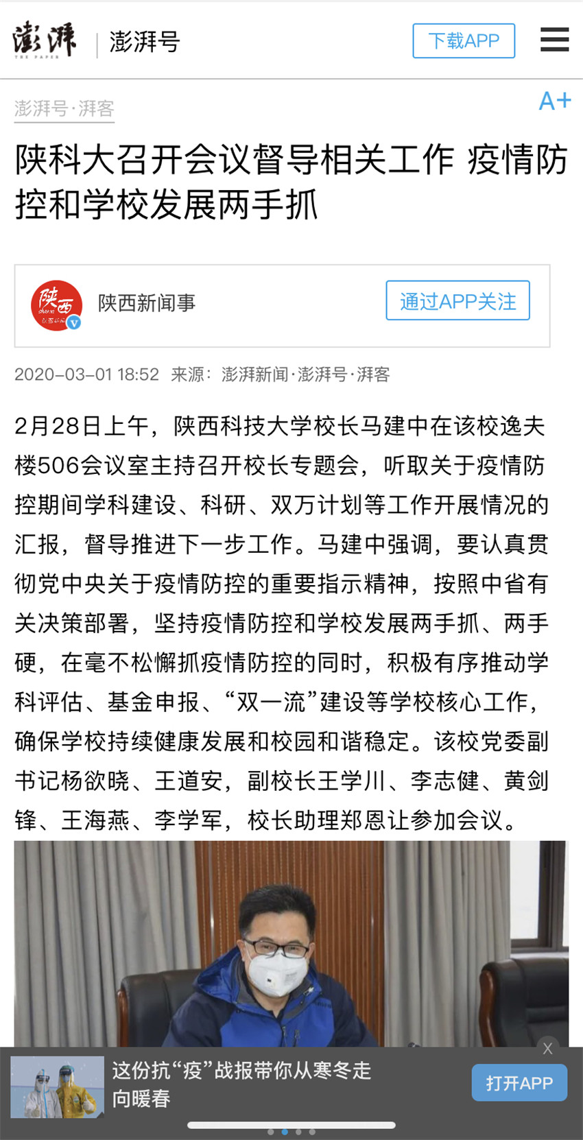 澎湃新聞客戶端:陜科大召開會(huì)議督導(dǎo)相關(guān)工作 疫情防控和學(xué)校發(fā)展兩手抓