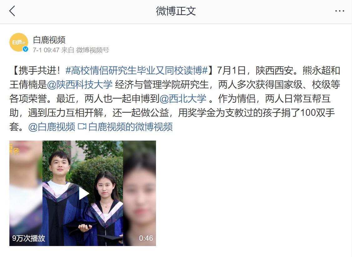 近日,白鹿視頻新浪微博賬號報(bào)道我校情侶研究生畢業(yè)又同赴西北大學(xué)讀博。