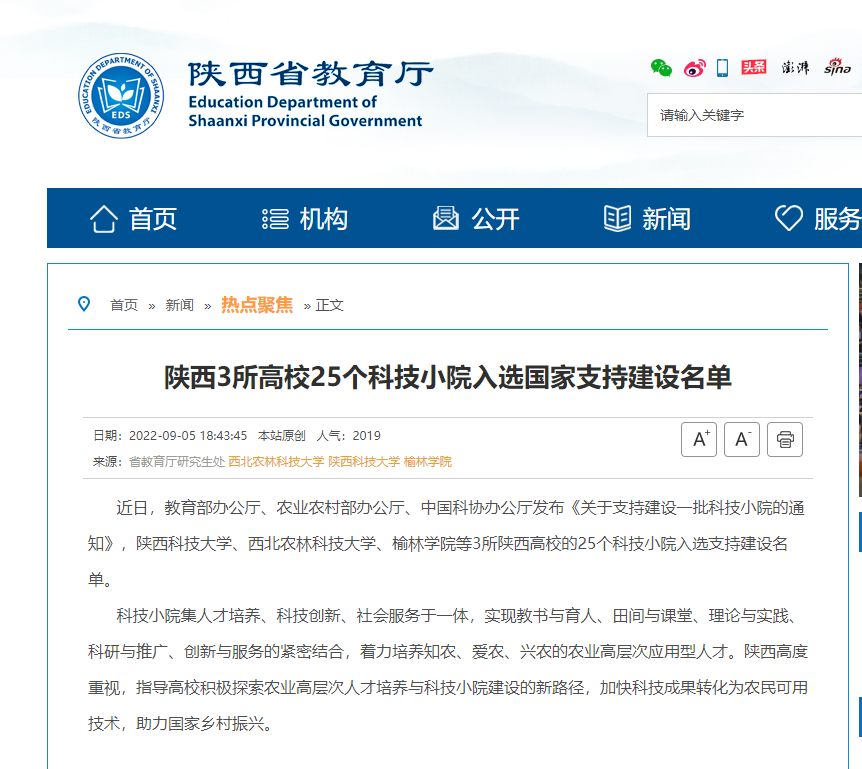 近日,陜西省教育廳官網(wǎng)、西安發(fā)布報道我校科技小院入選選國家支持建設科技小院名單。