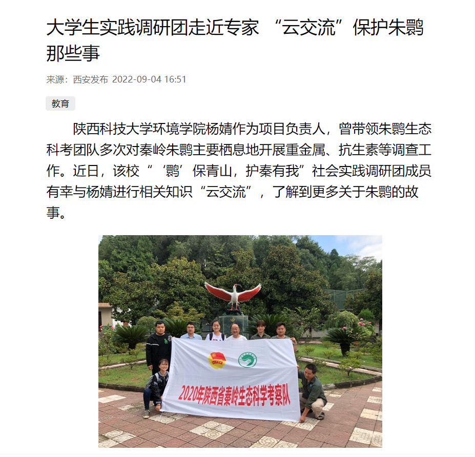 近日,西安發(fā)布、西安新聞網(wǎng)報道我校大學(xué)生實踐調(diào)研團走近專家 “云交流”保護朱鹮那些事。