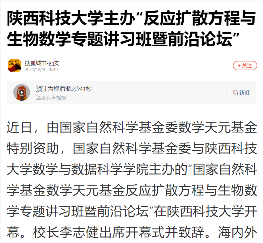 搜狐新聞:陜西科技大學(xué)主辦“反應(yīng)擴散方程與生物數(shù)學(xué)專題講習(xí)班暨前沿論壇”