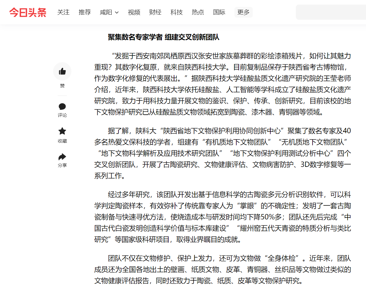 近日,今日頭條報(bào)道我校“黑科技”助力文物保護(hù)修復(fù)。