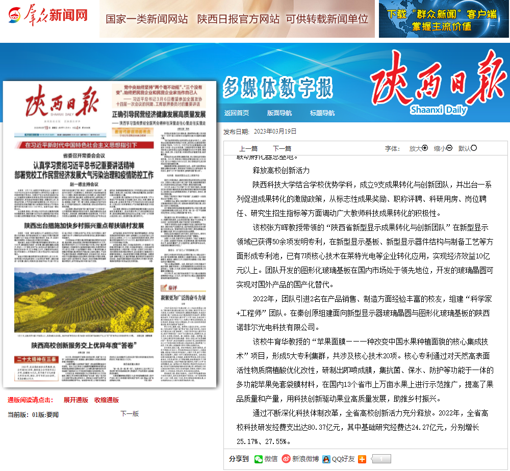 近日,《陜西日報》頭版報道我校釋放創(chuàng)新活力。