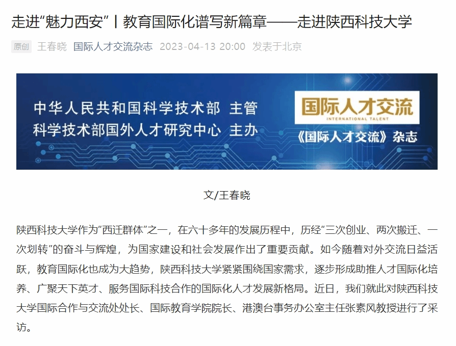 《國際人才交流》雜志官方微信公眾號:走進“魅力西安”丨教育國際化譜寫新篇章——走進陜西科技大學(xué)