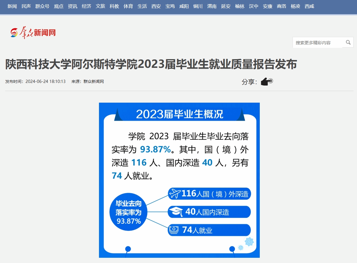 近日,群眾新聞網(wǎng)、西安發(fā)布、秦聞報道陜西科技大學阿爾斯特學院2023屆畢業(yè)生就業(yè)質(zhì)量報告發(fā)布。