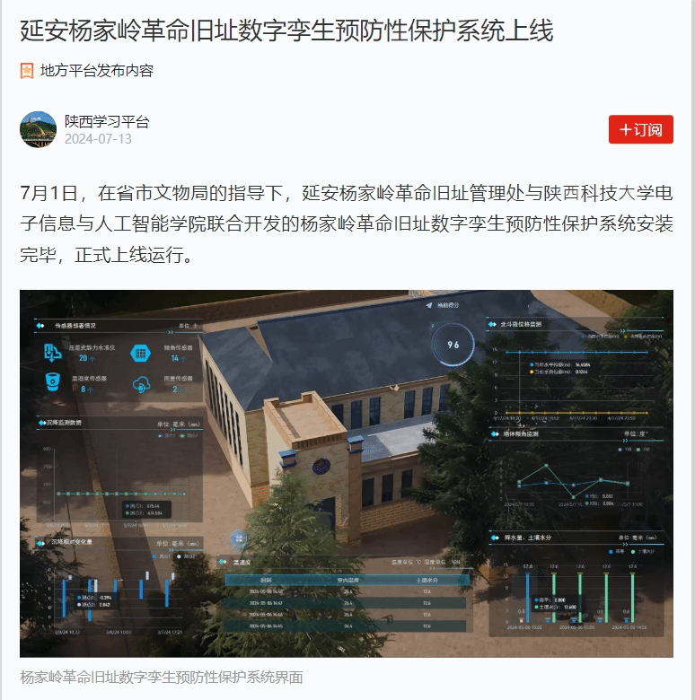 近日,學習強國陜西學習平臺報道延安楊家?guī)X革命舊址數(shù)字孿生預防性保護系統(tǒng)上線。