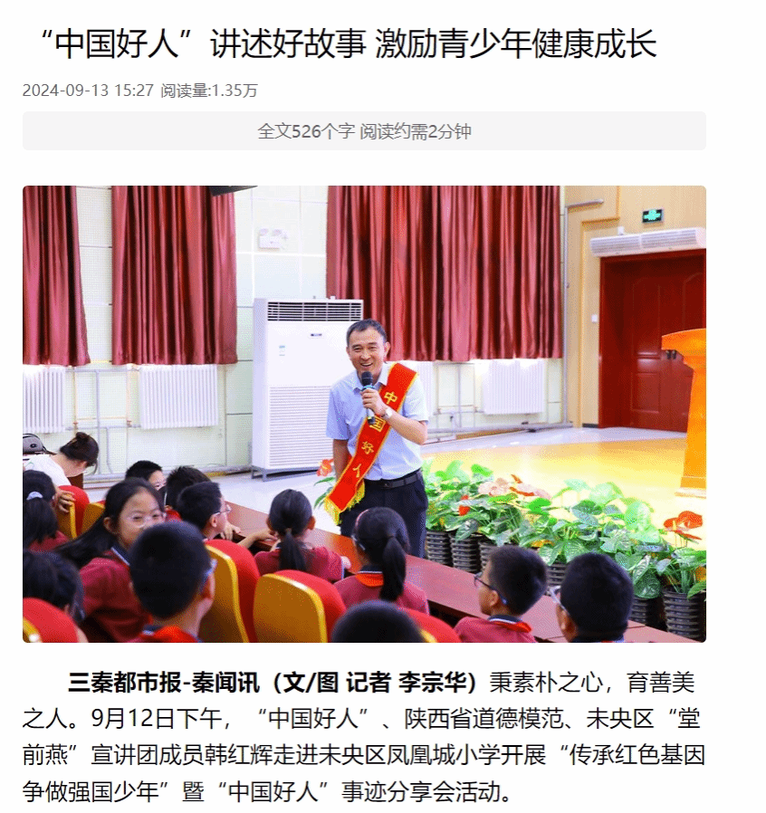 近日,秦聞報道我校“中國好人”韓紅輝講述好故事 激勵青少年健康成長。
