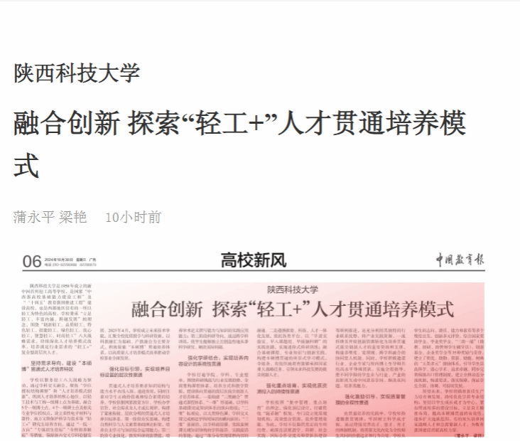 近日,《中國教育報(bào)》報(bào)道我校融合創(chuàng)新,探索“輕工+”人才貫通培養(yǎng)模式。