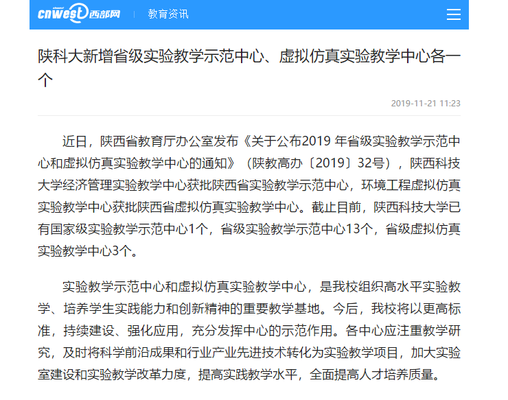 西部網(wǎng)報(bào)道:陜科大新增省級實(shí)驗(yàn)教學(xué)示范中心、虛擬仿真實(shí)驗(yàn)教學(xué)中心各一個(gè)