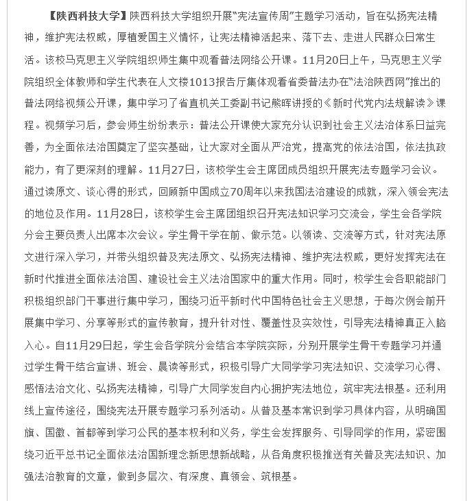 【陜西科技大學(xué)】陜西科技大學(xué)組織開展“憲法宣傳周”主題學(xué)習(xí)活動(dòng),旨在弘揚(yáng)憲法精神,維護(hù)憲法權(quán)威,厚植愛國(guó)主義情懷,讓憲法精神活起來、落下去、走進(jìn)人民群眾日常生活。該校馬克思主義學(xué)院組織師生集中觀看普法網(wǎng)絡(luò)公開課。11月20日上午,馬克思主義學(xué)院組織全體教師和學(xué)生代表在人文樓1013報(bào)告廳集體觀看省委普法辦在“法治陜西網(wǎng)”推出的普法網(wǎng)絡(luò)視頻公開課,集中學(xué)習(xí)了省直機(jī)關(guān)工委副書記熊暉講授的《新時(shí)代黨內(nèi)法規(guī)解讀》課程。視頻學(xué)習(xí)后,參會(huì)師生紛紛表示:普法公開課使大家充分認(rèn)識(shí)到社會(huì)主義法治體系日益完善,為全面依法治國(guó)奠定了堅(jiān)實(shí)基礎(chǔ),讓大家對(duì)全面從嚴(yán)治黨,提高黨的依法治國(guó),依法執(zhí)政能力,有了更深刻的理解。11月27日,該校學(xué)生會(huì)主席團(tuán)成員組織開展憲法專題學(xué)習(xí)會(huì)議。通過讀原文、談心得的形式,回顧新中國(guó)成立70周年以來我國(guó)法治建設(shè)的成就,深入領(lǐng)會(huì)憲法的地位及作用。11月28日,該校學(xué)生會(huì)主席團(tuán)組織召開憲法知識(shí)學(xué)習(xí)交流會(huì),學(xué)生會(huì)各學(xué)院分會(huì)主要負(fù)責(zé)人出席本次會(huì)議。學(xué)生骨干學(xué)在前、做示范。以領(lǐng)讀、交流等方式,針對(duì)憲法原文進(jìn)行深入學(xué)習(xí),并帶頭組織普及憲法原文、弘揚(yáng)憲法精神、維護(hù)憲法權(quán)威,更好發(fā)揮憲法在新時(shí)代推進(jìn)全面依法治國(guó)、建設(shè)社會(huì)主義法治國(guó)家中的重大作用。同時(shí),校學(xué)生會(huì)各職能部門積極組織部門干事進(jìn)行集中學(xué)習(xí),圍繞習(xí)近平新時(shí)代中國(guó)特色社會(huì)主義思想,于每次例會(huì)前開展集中學(xué)習(xí)、分享等形式的宣傳教育,提升針對(duì)性、覆蓋性及實(shí)效性,引導(dǎo)憲法精神真正入腦入心。自11月29日起,學(xué)生會(huì)各學(xué)院分會(huì)結(jié)合本學(xué)院實(shí)際,分別開展學(xué)生骨干專題學(xué)習(xí)并通過學(xué)生骨干結(jié)合宣講、班會(huì)、晨讀等形式,積極引導(dǎo)廣大同學(xué)學(xué)習(xí)憲法知識(shí)、交流學(xué)習(xí)心得、感悟法治文化、弘揚(yáng)憲法精神,引導(dǎo)廣大同學(xué)發(fā)自內(nèi)心擁護(hù)憲法地位,筑牢憲法根基。還利用線上宣傳途徑,圍繞憲法開展專題學(xué)習(xí)系列活動(dòng)。從普及基本常識(shí)到學(xué)習(xí)具體內(nèi)容,從明確國(guó)旗、國(guó)徽、首都等到學(xué)習(xí)公民的基本權(quán)利和義務(wù),學(xué)生會(huì)發(fā)揮服務(wù)、引導(dǎo)同學(xué)的作用,緊密圍繞習(xí)近平總書記全面依法治國(guó)新理念新思想新戰(zhàn)略,從各角度積極推送有關(guān)普及憲法知識(shí)、加強(qiáng)法治教育的文章,做到多層次、有深度、真領(lǐng)會(huì)、筑根基。