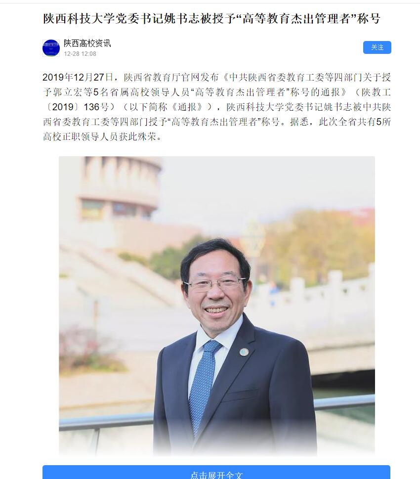 今日頭條APP:陜西科技大學(xué)黨委書記姚書志被授予“高等教育杰出管理者”稱號(hào)