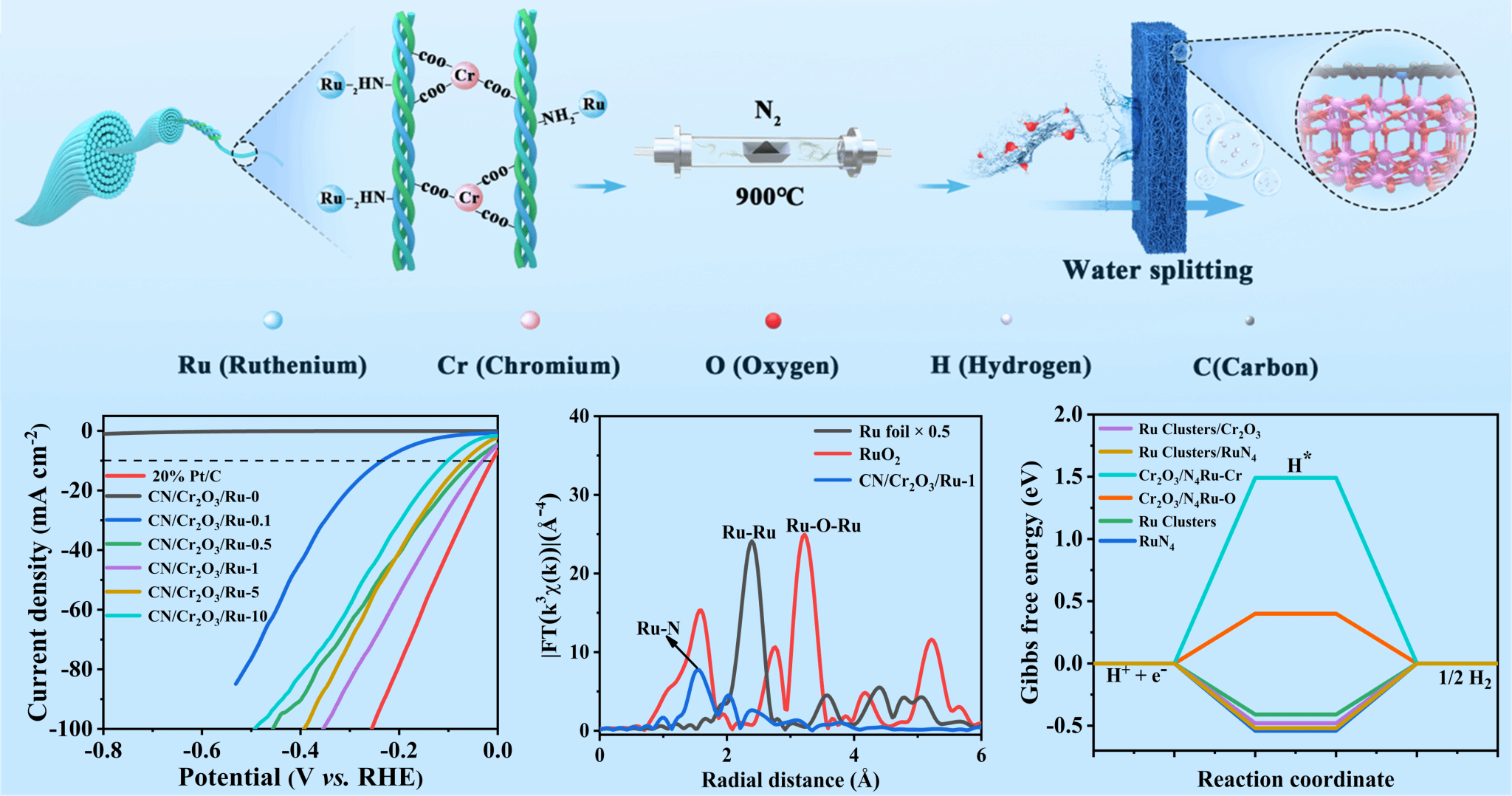 韓慶鑫副教授為生物質(zhì)與功能材料研究所(王學(xué)川教授科研團(tuán)隊(duì))成員,長期從事生物質(zhì)資源化利用及功能材料的研究。固體廢棄物的處理也是構(gòu)建廢棄物循環(huán)利用體系是實(shí)施全面節(jié)約戰(zhàn)略、保障國家資源安全、積極穩(wěn)妥推進(jìn)碳達(dá)峰碳中和、加快發(fā)展方式綠色轉(zhuǎn)型的重要舉措。制革廢棄物高價值回收已成為皮革行業(yè)的關(guān)鍵關(guān)注點(diǎn),尤其是處理鞣革后產(chǎn)生的鉻革屑,是迫切需要解決的問題。如果能利用含鉻革屑制備含鉻電催化劑,將其中的鉻轉(zhuǎn)化為具有高附加值的產(chǎn)物,既可消除皮革廢棄物對環(huán)境的污染又符合循環(huán)經(jīng)濟(jì)和可持續(xù)發(fā)展的要求?;诖?,韓慶鑫等人利用鉻革屑膠原纖維表面官能團(tuán)在熱解過程中固定Ru原子,成功制備了一種具有廣泛pH適用范圍的析氫反應(yīng)(HER)電催化劑。由于含鉻革屑表面存在大量的氨基,釕離子(Ru3+)可以通過形成CL-NH2-Ru絡(luò)合物吸附在含鉻革屑的表面,這使其在高溫煅燒的過程會盡可能避免形成Ru納米顆粒,而且含鉻革屑當(dāng)中的鉻元素也可以起到提升HER性能的作用。優(yōu)化后的樣品CN/Cr2O3/Ru-1表現(xiàn)出優(yōu)異的電催化性能,在1.0 M KOH中,電流密度為10 mA cm -2時的過電位僅為-28 mV,在酸性和中性電解液中也表現(xiàn)出良好的電催化性能,超過了已報(bào)道的大多數(shù)以Ru為催化中心的催化劑。密度泛函理論(DFT)計(jì)算表明,Cr2O3中的氧(O)和鉻(Cr)能與釕(Ru)原子的配位模式發(fā)生有利的相互作用,從而闡明了CN/Cr2O3/Ru中Cr對催化中心Ru的協(xié)同增強(qiáng)作用。該研究工作既為含鉻制革廢棄物提供了綠色處理方案,又為開發(fā)高性能、低成本電催化劑開辟了新途徑,展現(xiàn)了環(huán)保與新能源材料研發(fā)的雙重潛力。上述工作以“Atomic-scale Ru anchored on chromium-shavings as a precursor for a pH-universal hydrogen evolution reaction electrocatalyst”為題已在線發(fā)表,全文鏈接:https://pubs.rsc.org/en/content/articlelanding/2024/mh/d3mh01951a 。該工作得到了國家自然科學(xué)基金項(xiàng)目(21908140),陜西省教育廳科學(xué)研究計(jì)劃(22JP006),輕化工助劑化學(xué)與技術(shù)教育部重點(diǎn)實(shí)驗(yàn)室和陜西省輕化工助劑化學(xué)與技術(shù)協(xié)同創(chuàng)新中心開放基金(KFKT2021-15)的資助。